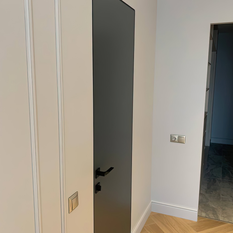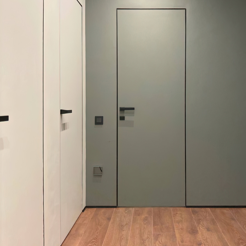 Скрытые двери это уникальное решение для современных дизайнов помещения. Дверное полотно и коробка изготавливаются с использованием алюминиевого профиля. Такие полотна встраиваются в один уровень со стеной помещения, без видимой дверной коробки и наличников.
